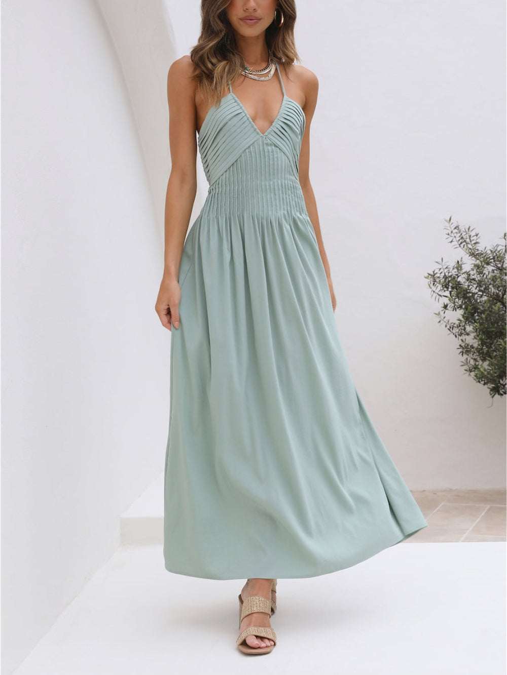 Crafted from lightweight and breathable fabric. this maxi dress features a flowy silhouette that drapes beautifully over your figure. creating an ethereal and romantic look. The back cutout detail adds a touch of allure and sophistication. while the halter neckline provides a flattering and feminine finish.