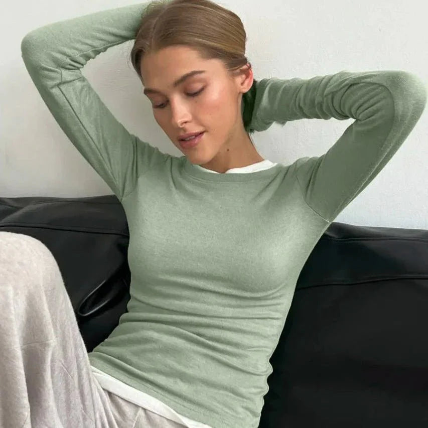 Design: A timeless O-neck tee featuring a sleek. minimalist silhouette with full-length sleeves. Its versatile style makes it perfect for layering or wearing solo.