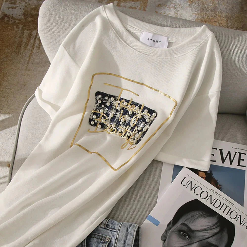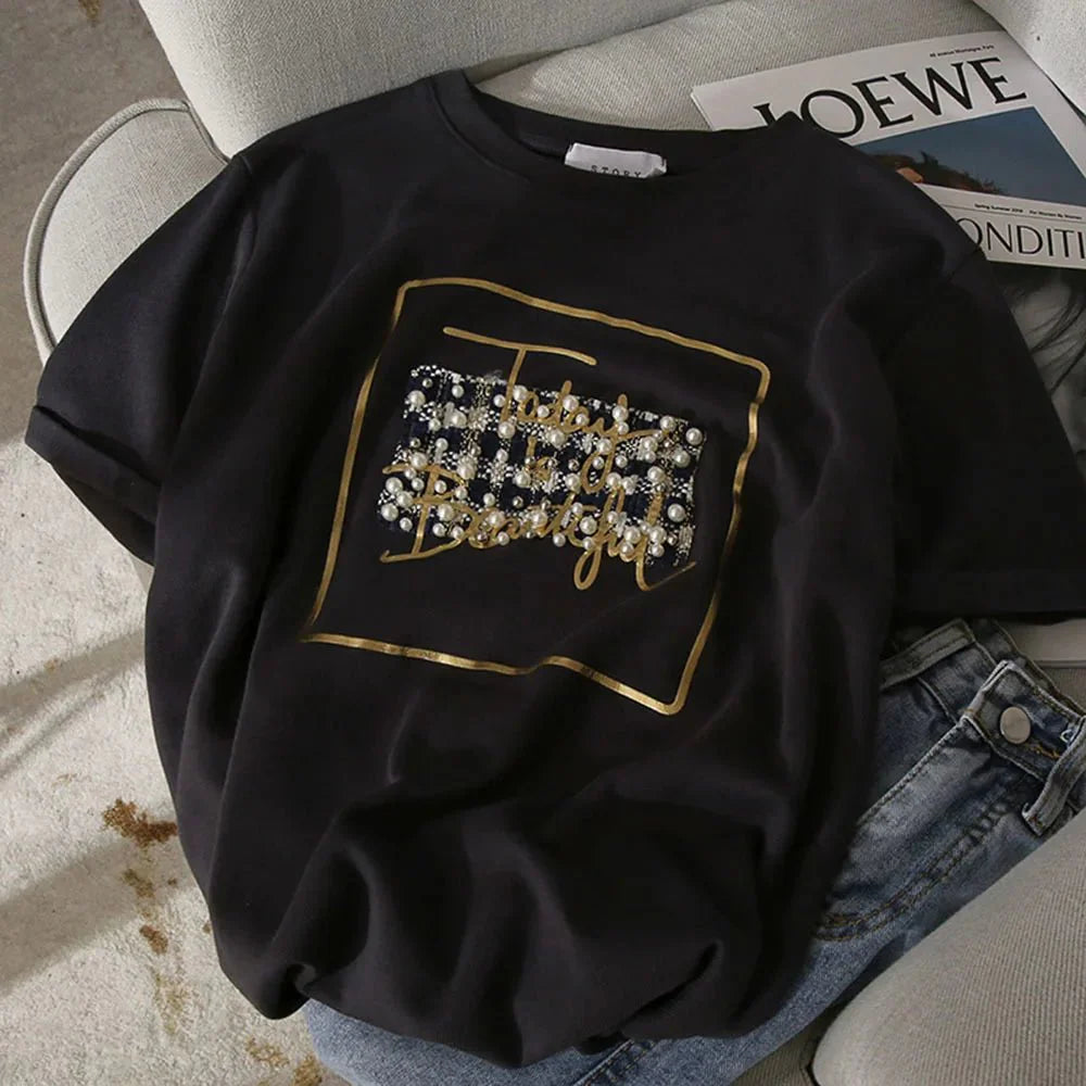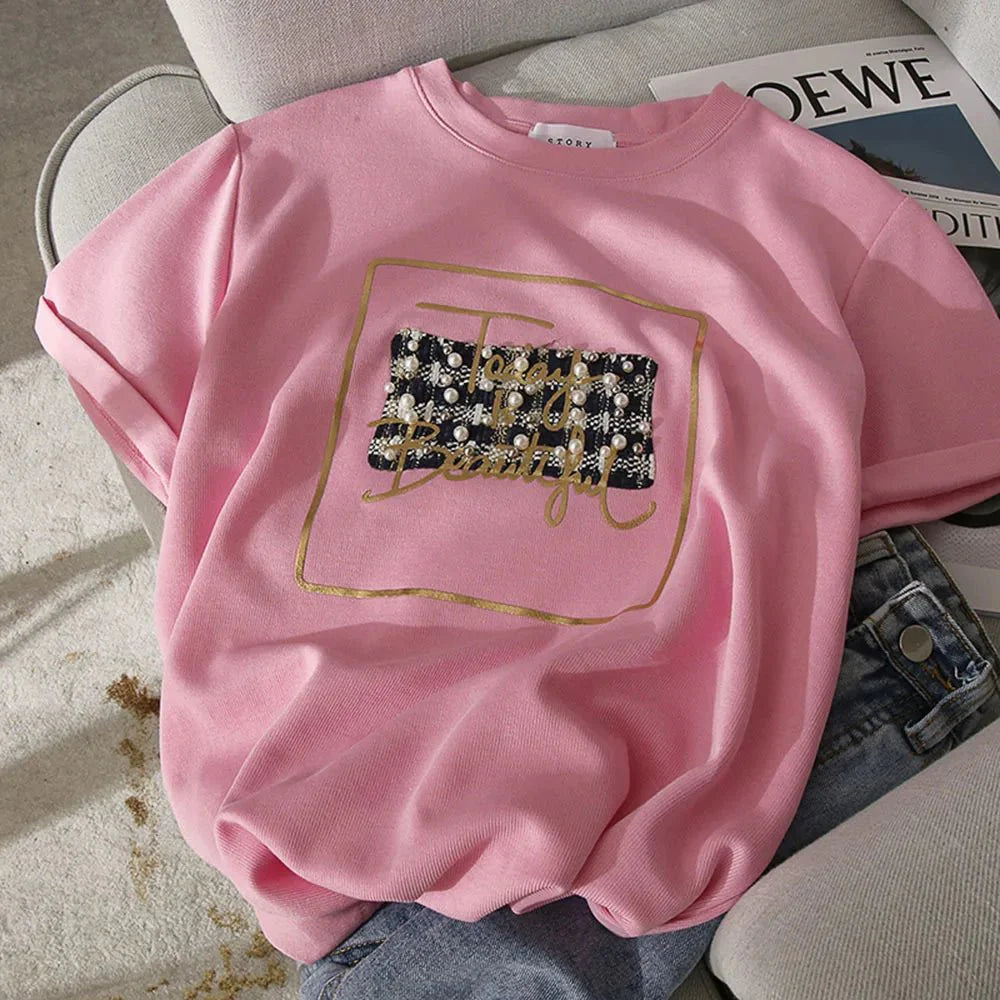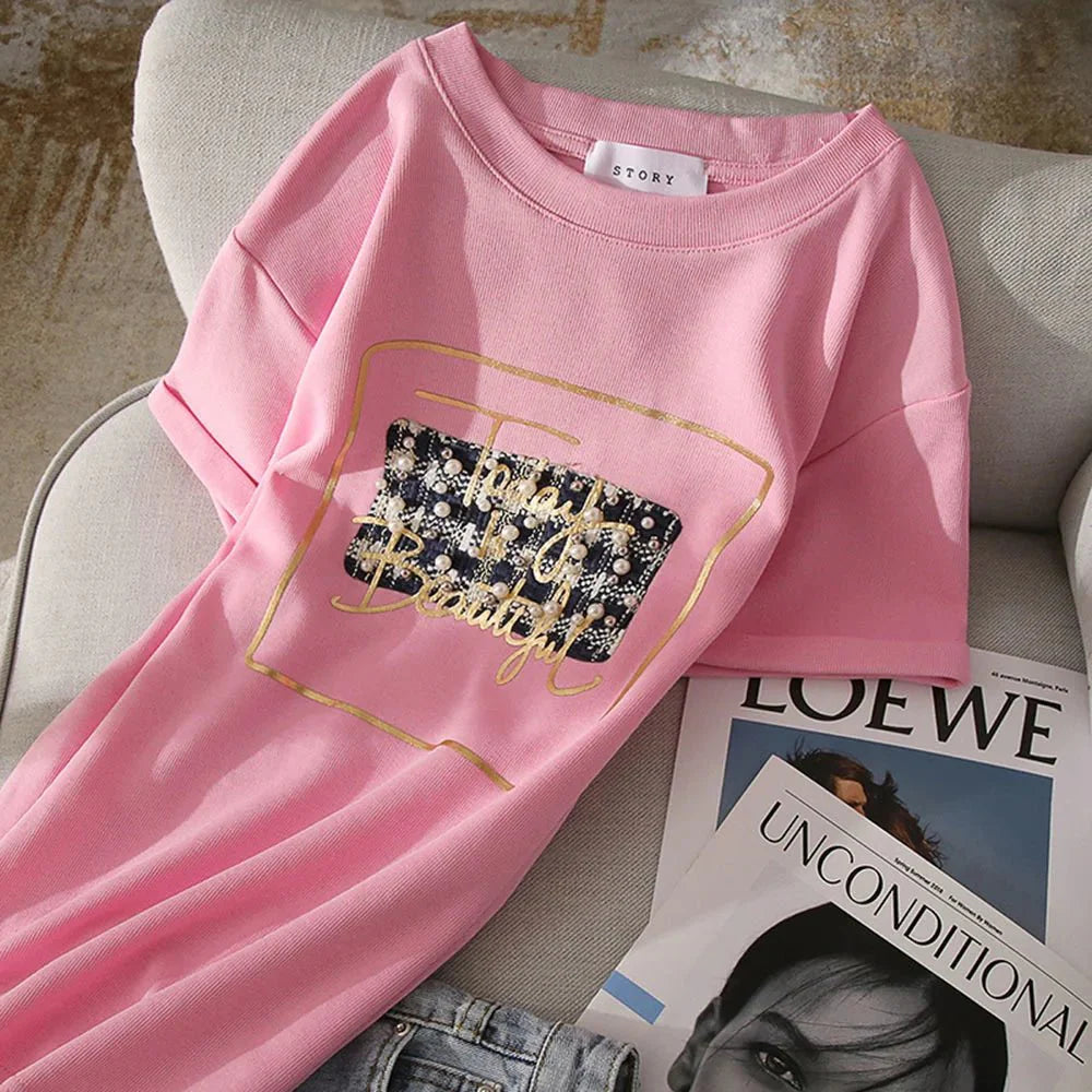 Trendy women's cotton T-shirt featuring beaded letter print and embroidered flare details. Casual O-neck design with short sleeves and a straight fit. perfect for summer. Crafted from soft broadcloth material for comfort and style.