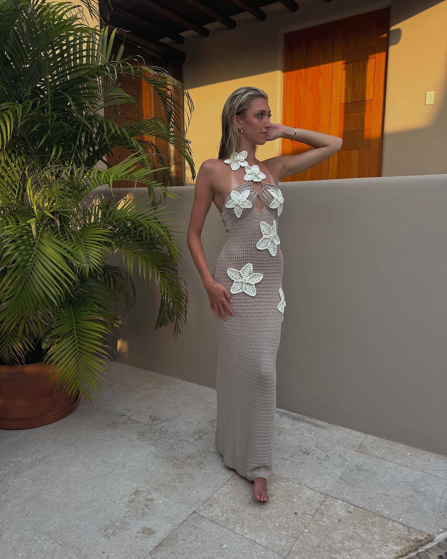 This charming piece exudes femininity and elegance. The functional halter neck design adds a touch of glamor and allows for custom styling. while delicate crochet floral appliqués add a romantic and whimsical feel to the dress. The fishtail hem shape adds drama and elegance. creating a stunning silhouette that's sure to turn heads. Perfect for special occasions or to enhance your everyday look.