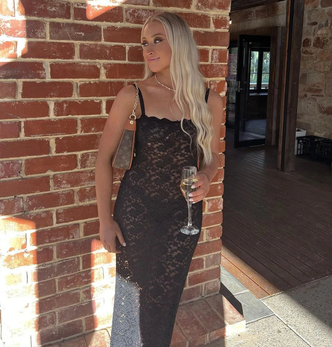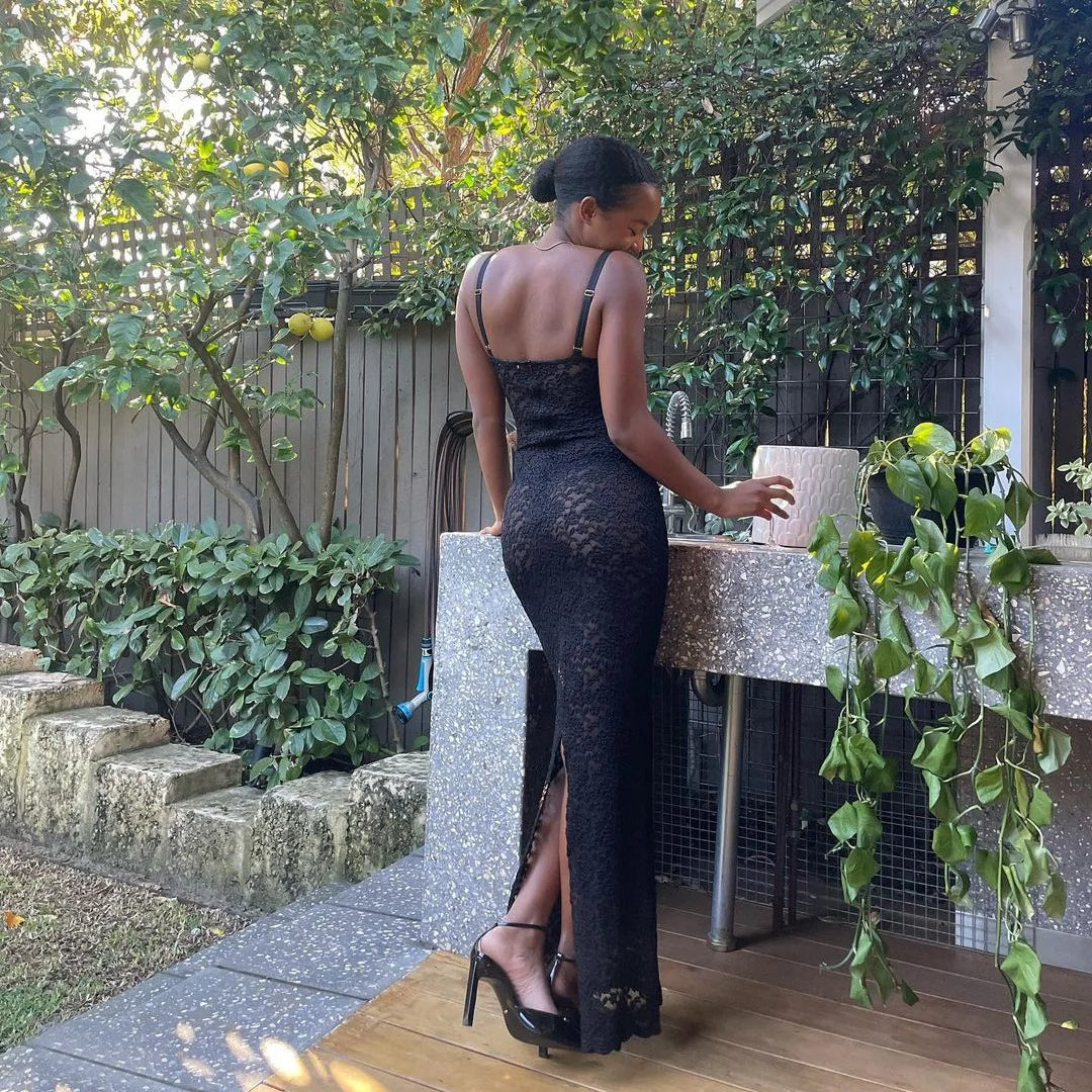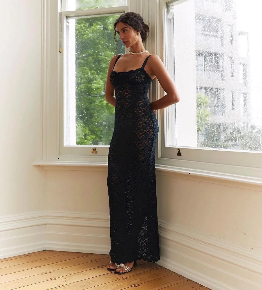 Turn heads in the Carolyn Lace Up Maxi Dress by Bella Chix. a playful blend of sheer lace and sultry design. This sleeveless. see-through maxi dress features a flattering lace-up detail that adds a flirty touch. perfect for making a sexy statement with coquette charm. Ideal for evenings when you want to feel bold and effortlessly captivating.