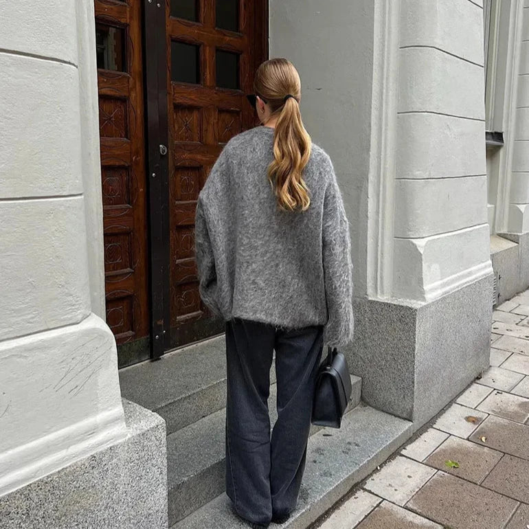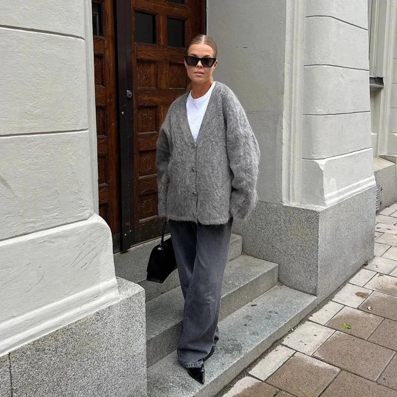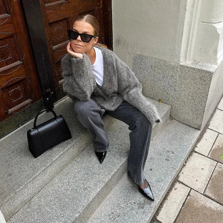 This cozy Chiara Knitted Cardigan by Bella Chix is perfect for those chilly days. With its grey knit. v-neck design. and long sleeves. you'll stay warm and stylish all day long. It's like a hug you can wear (but without the awkwardness).