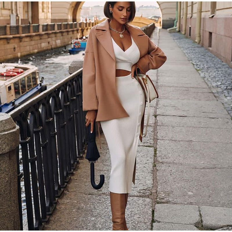 This Claire Knitted Crop Top Skirt Set by Bella Chix offers a stylish and comfortable look. It features a flattering V-Neck Crop Top. while the Button Split Skirt hugs your body and provides a snug fit. The perfect combination of fashion and functionality.
