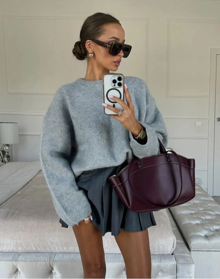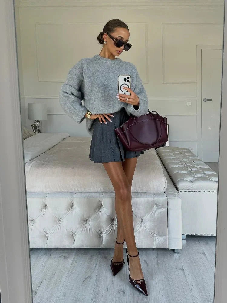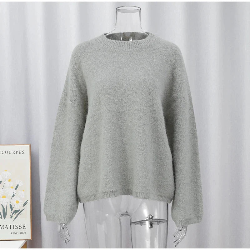 Women's knitted long-sleeve sweater with an O-neck and loose fit. perfect for high street fashion. Made from 81%-90% polyester. featuring slight stretch. solid color. and standard thickness. A versatile autumn/winter pullover for casual or commute wear. Regular length with a chic. elegant design.