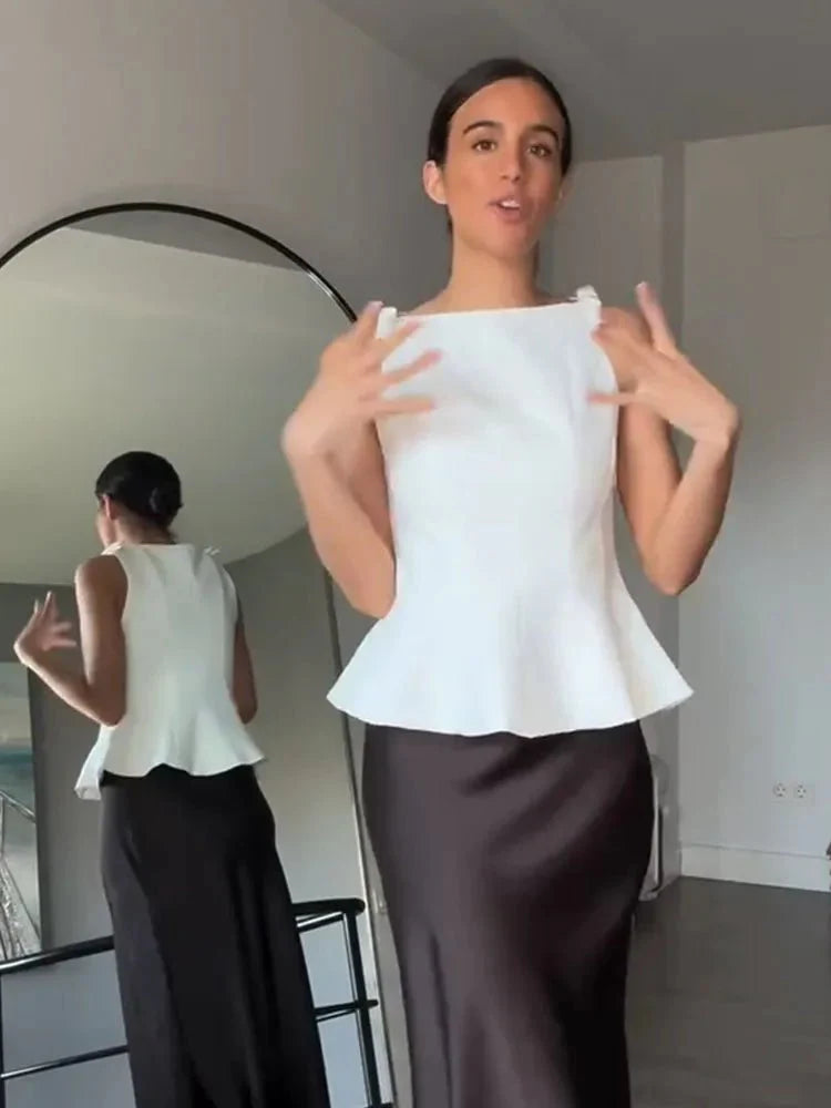 Design: A chic. slim-fit tank top featuring a round neckline. stylish backless detail. and a playful bow-accented flared hem. The sleek silhouette adds a modern streetwear edge to your wardrobe.