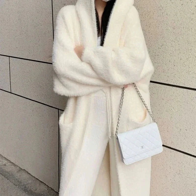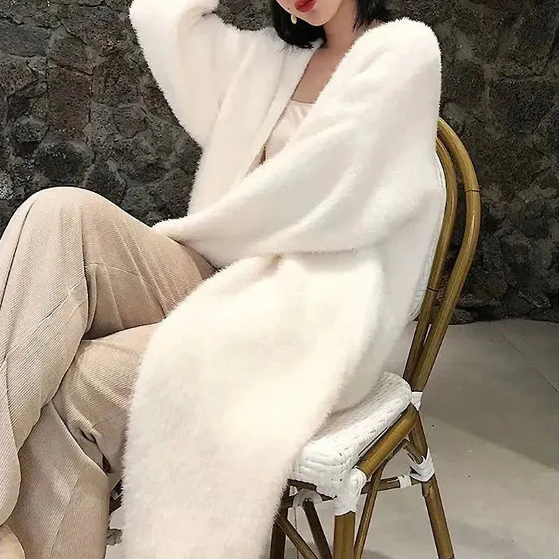 Stay warm in this white long cardigan for women. featuring a fluffy knit design and batwing sleeves. Made from high-stretch polyester with a loose fit and thick texture. this open-stitch cashmere-style sweater coat is perfect for vintage-inspired winter fashion.