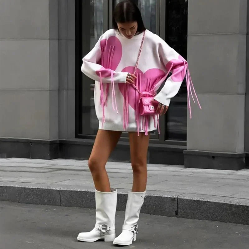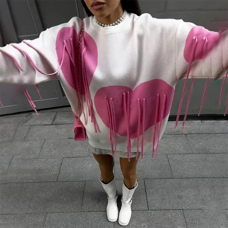 Stay stylish and cozy with the Heart Print Sweater. a perfect blend of comfort and high-street fashion. Featuring a charming heart print and tassel accents. this O-neck. long-sleeve pullover is a standout choice for casual outings and chic streetwear looks.
