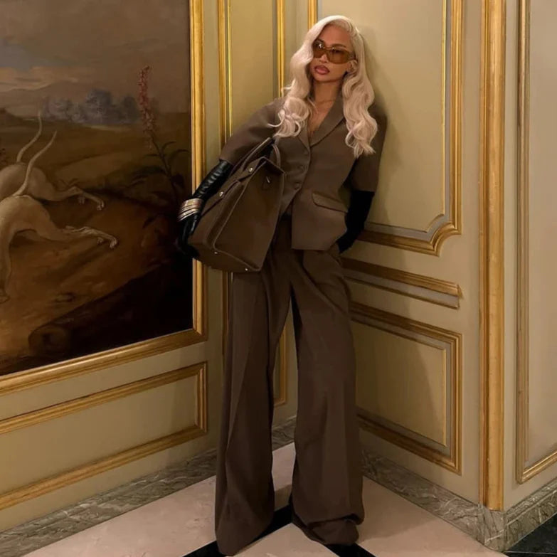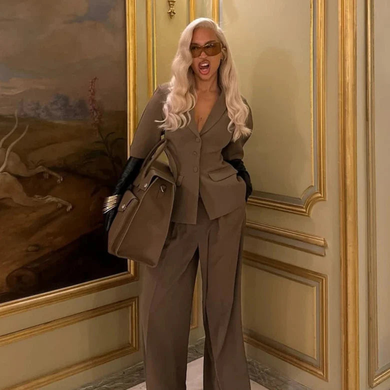 Get ready to slay in style with Bella Chix's Kimpora Pants Set! This trendy blazer and wide leg trouser combo features shoulder pads and a button closure for a polished look. The short sleeves add a touch of sophistication while keeping you cool. Perfect for work. parties. and beyond!