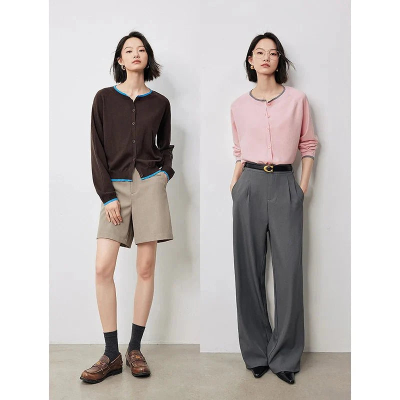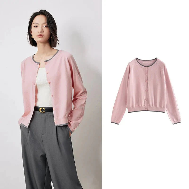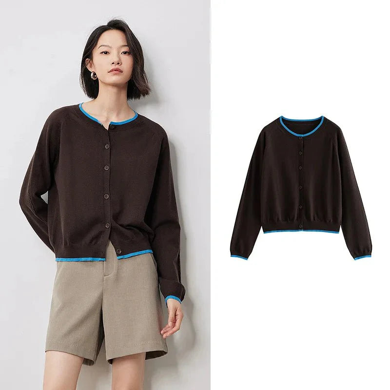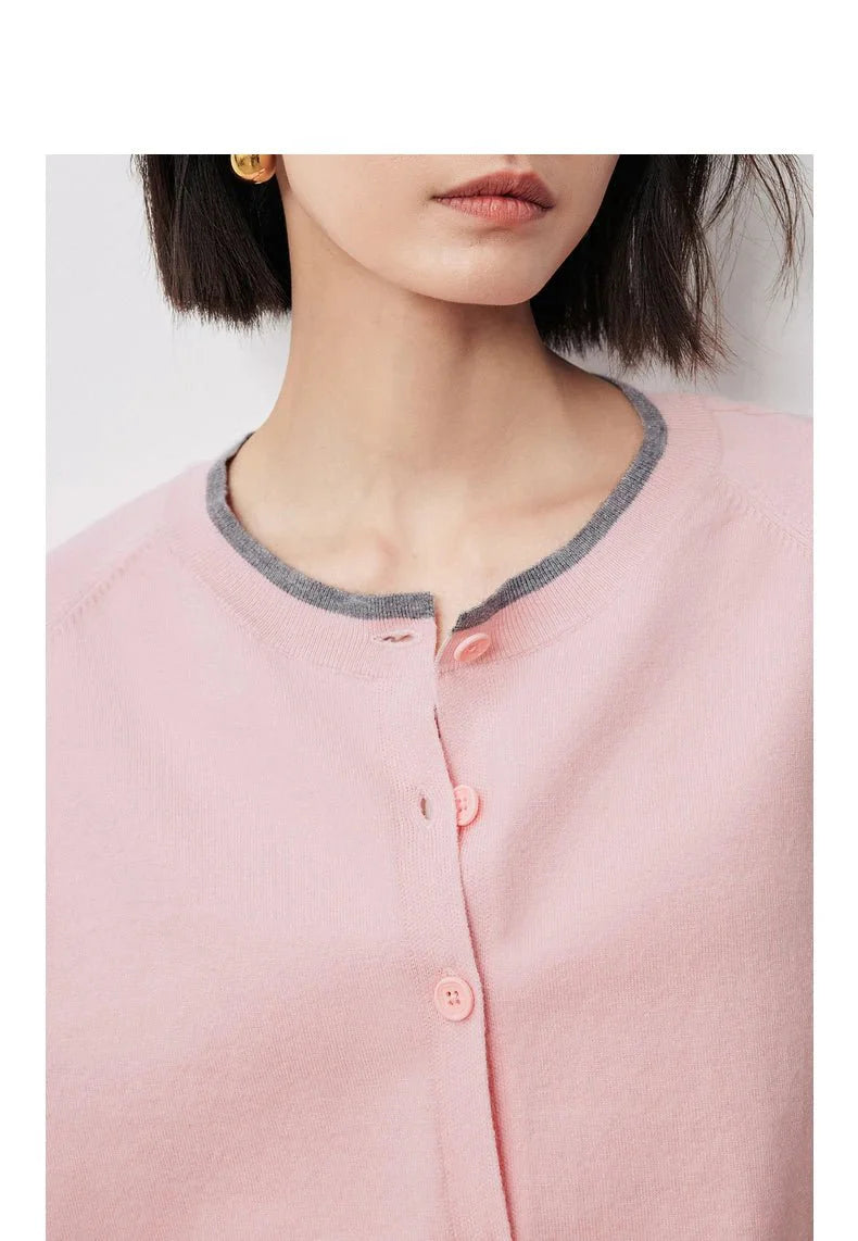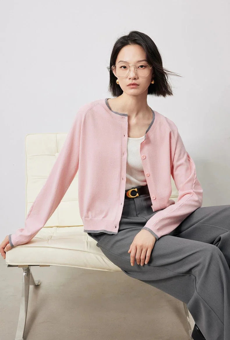 Design: A timeless knitted cardigan featuring a round neck. raglan sleeves. and a classic button-front closure for effortless elegance.