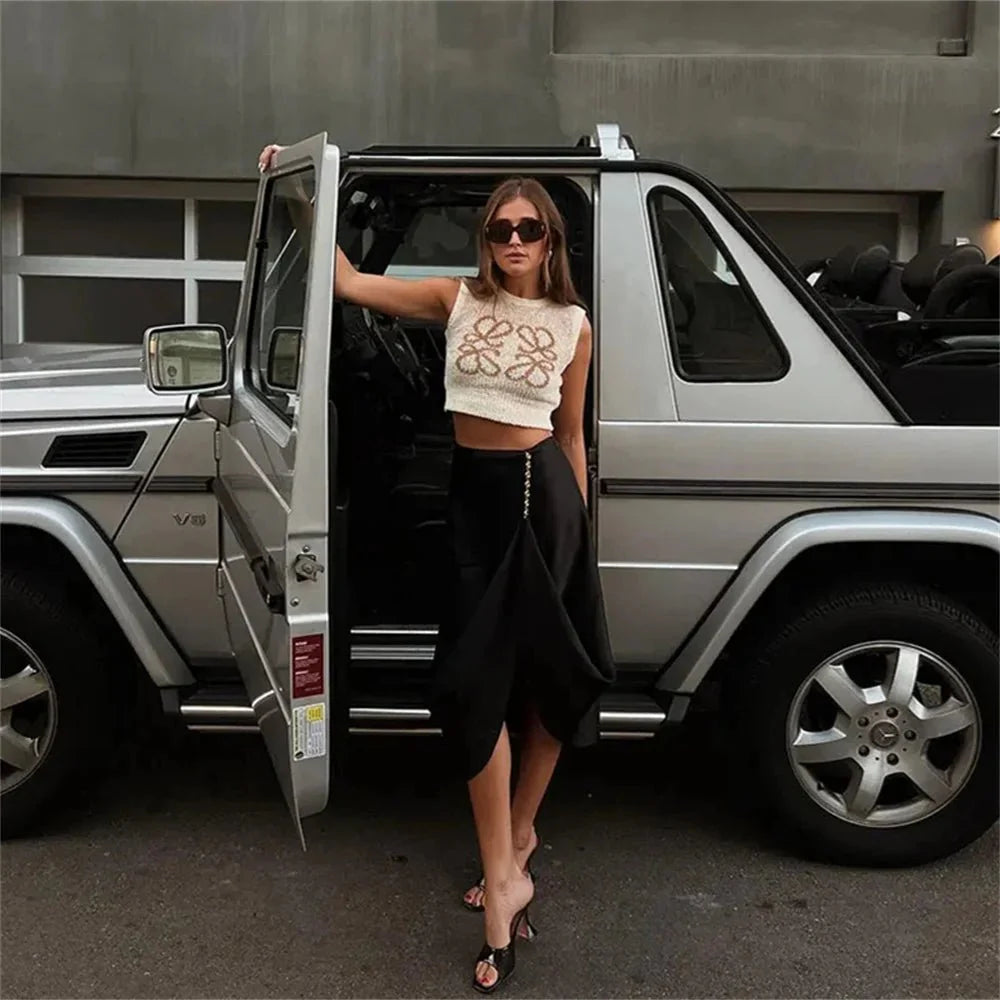 Design: A vintage-inspired sleeveless crop tank featuring an intricate crochet floral pattern. classic O-neckline. and a slim-fitting silhouette. The fine-knit construction and charming details bring a touch of retro elegance to any look.