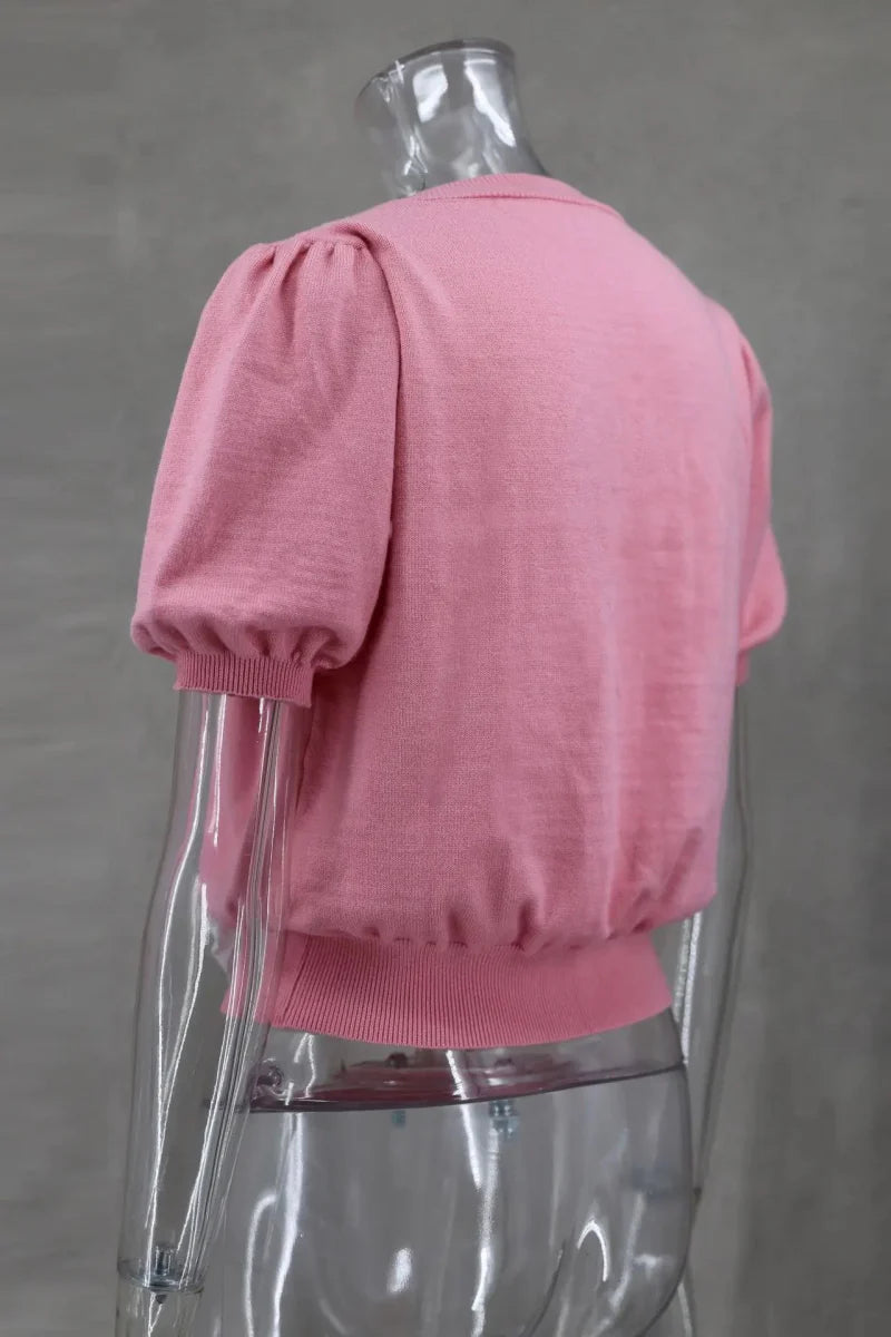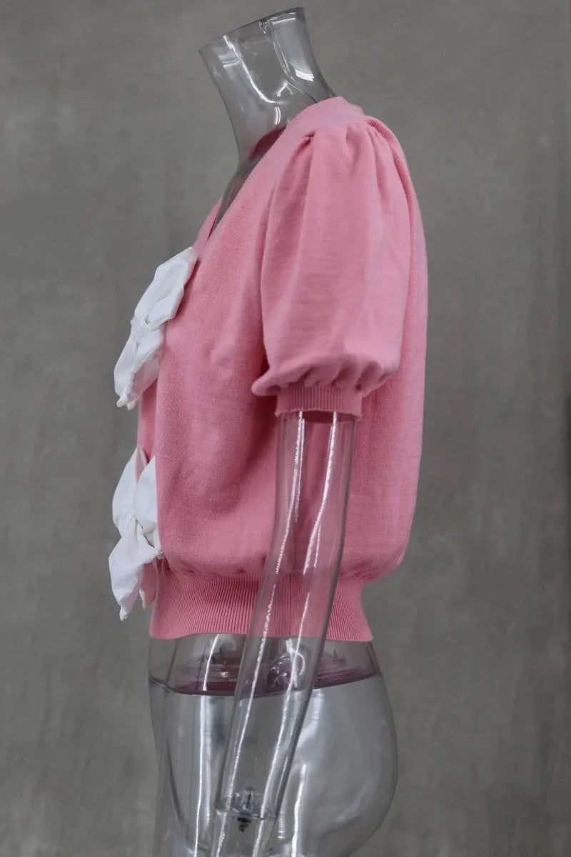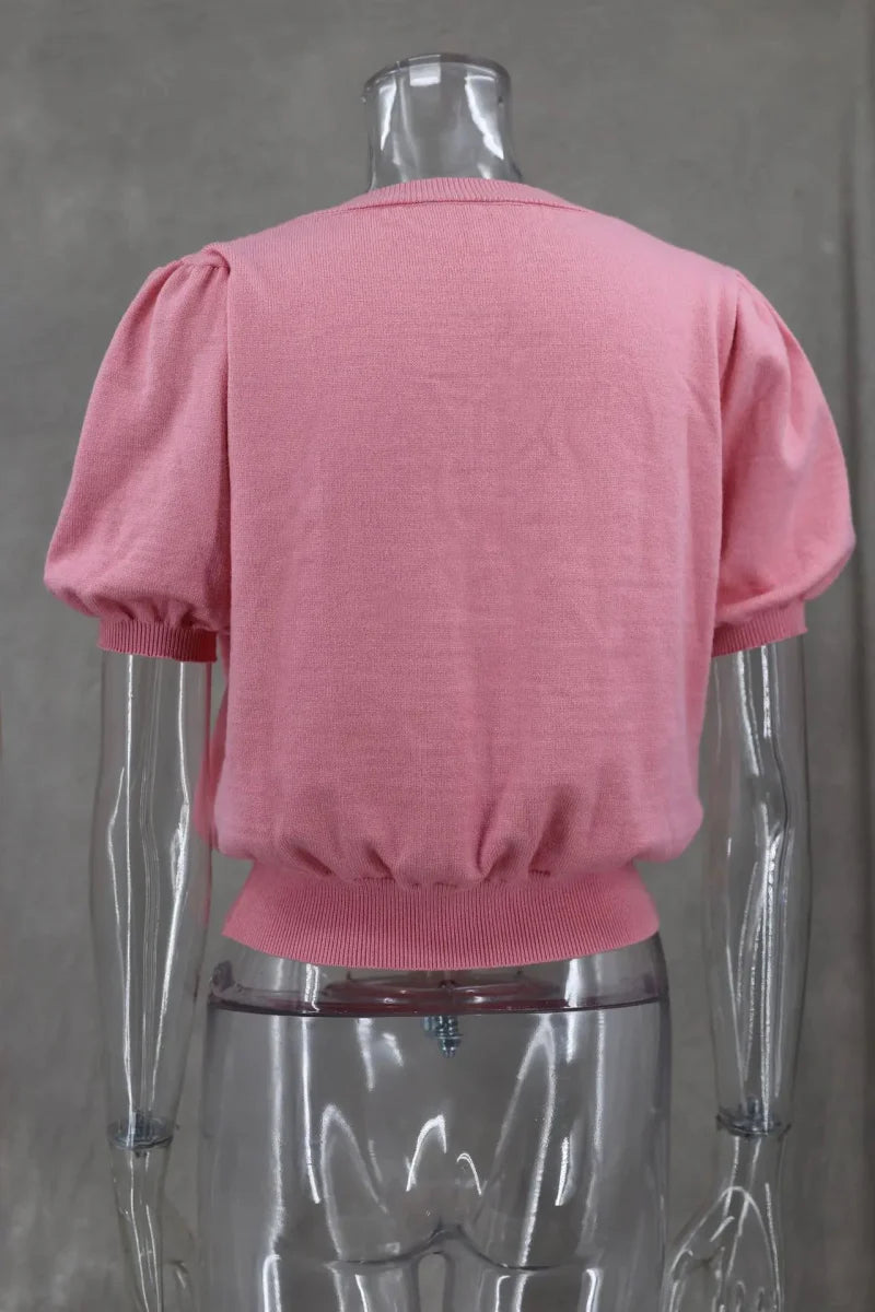 Elevate your casual wardrobe with this stylish knitted V-neck shirt featuring short puff sleeves. Made from high-stretch polyester. this slim-fit top offers a comfortable and flattering silhouette. The solid pattern and delicate bow decoration add a feminine touch. while the thin thickness makes it perfect for layering or wearing alone. With a regular clothing length and loose-fitting design. this shirt is ideal for various occasions. from casual outings to relaxed gatherings. Enjoy effortless style with this versatile piece!