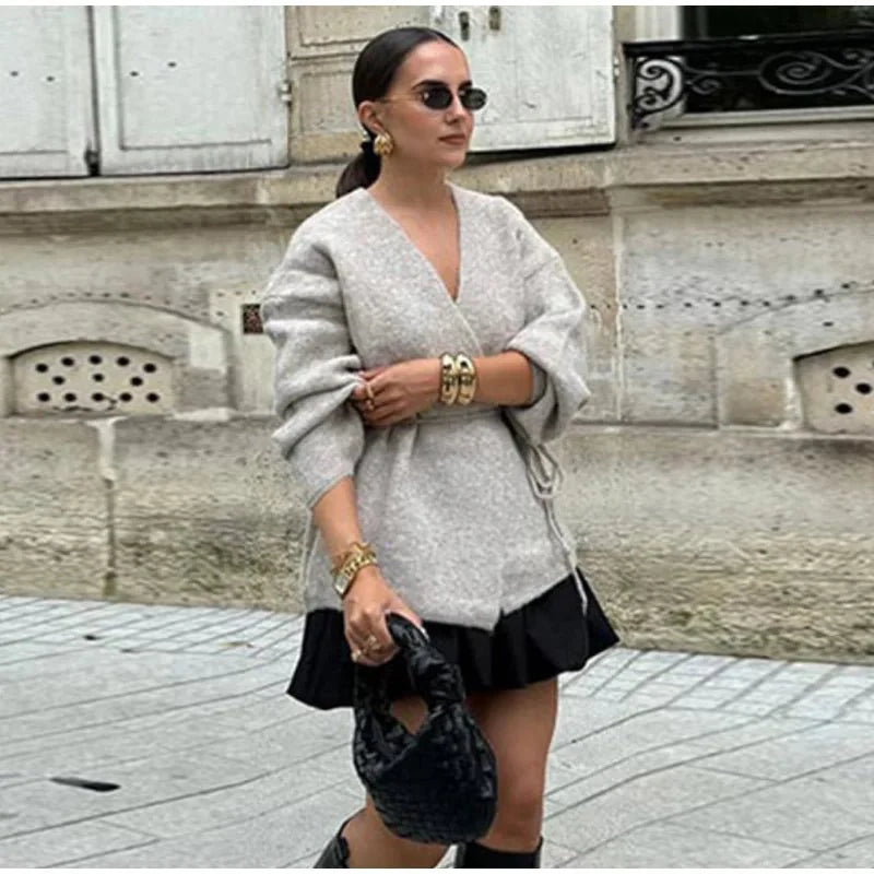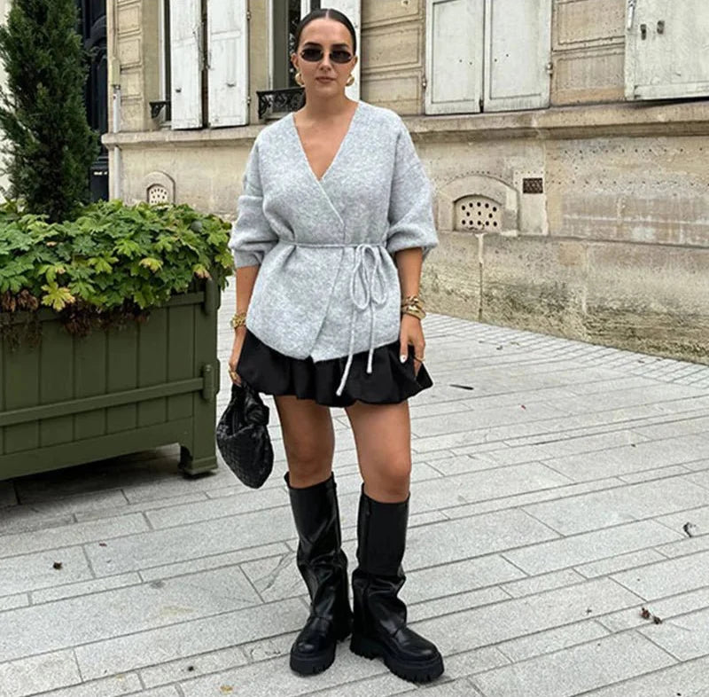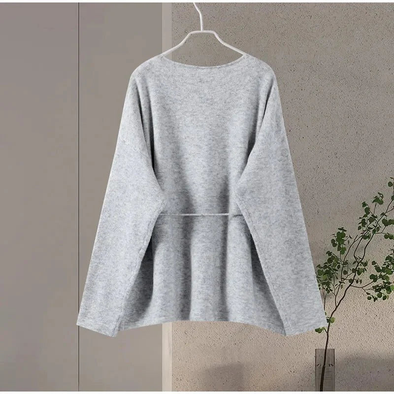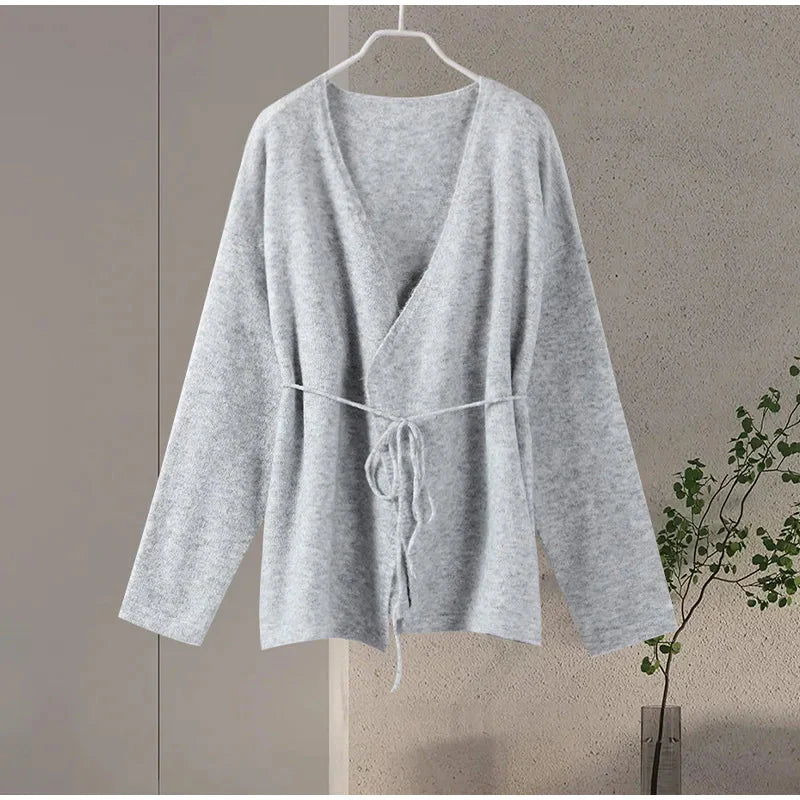 Design: A short. loose-fit cardigan with a flattering V-neck and stylish lace-up detail. The open front with no fastening allows for versatile layering. while the turn-down collar adds a relaxed. chic touch to the overall look.