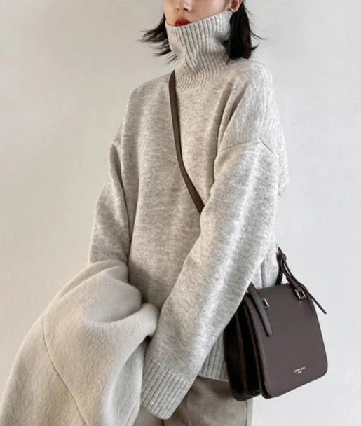 Design: A loose-fitting turtleneck sweater featuring a half-high collar. fine knit texture. and a relaxed silhouette for effortless layering.
