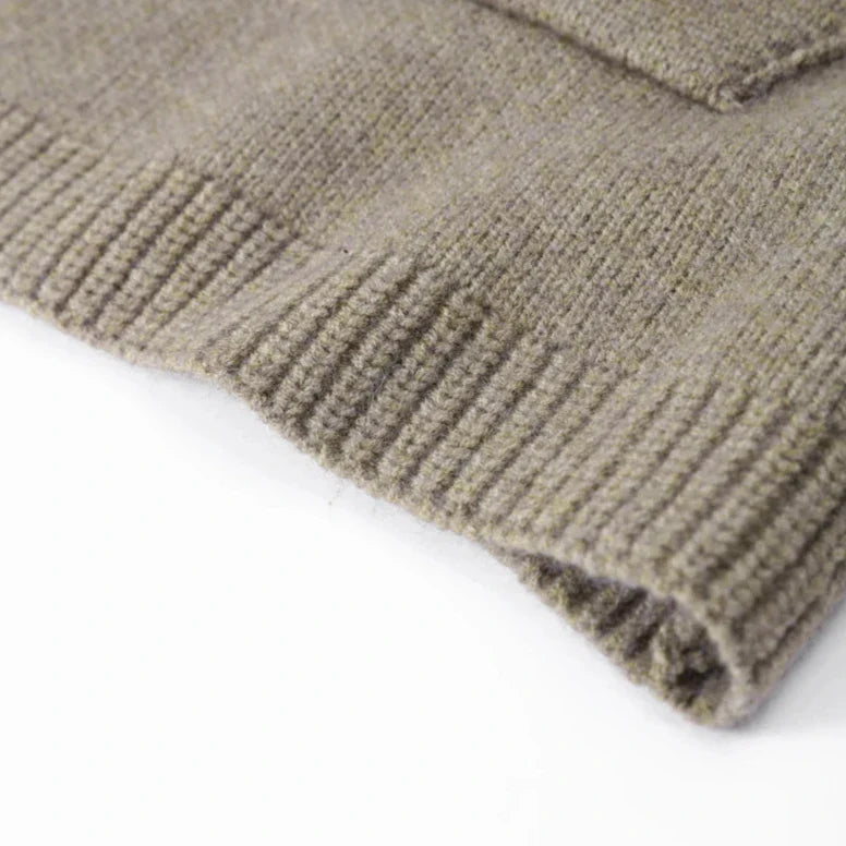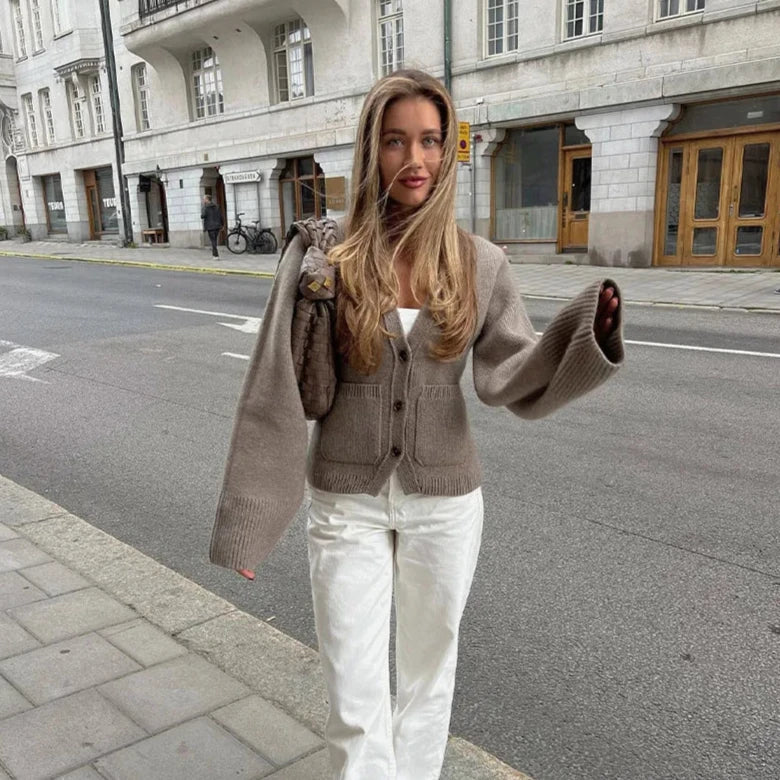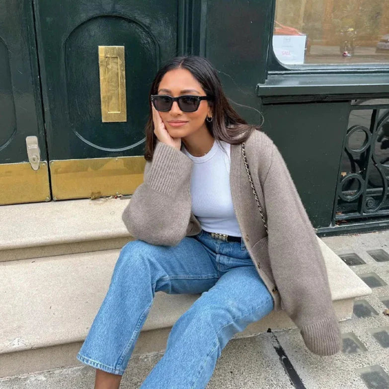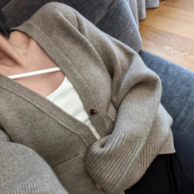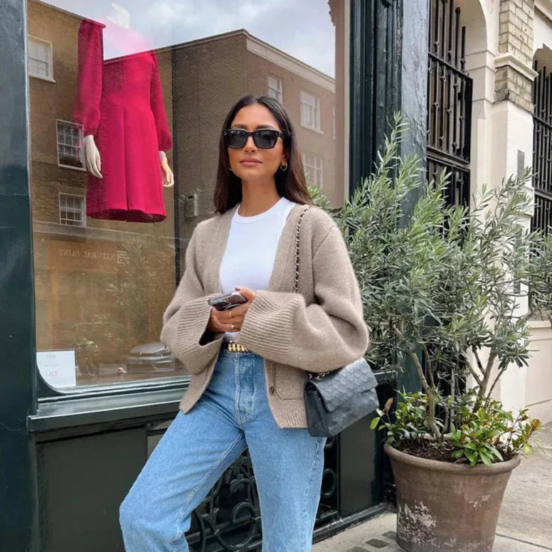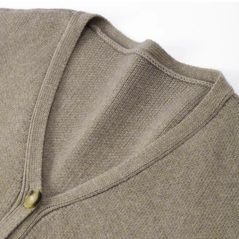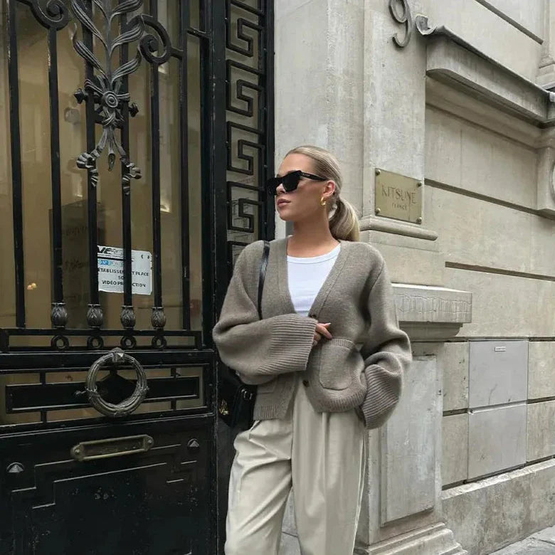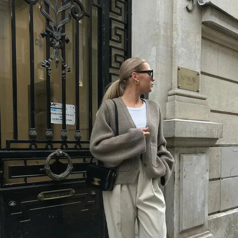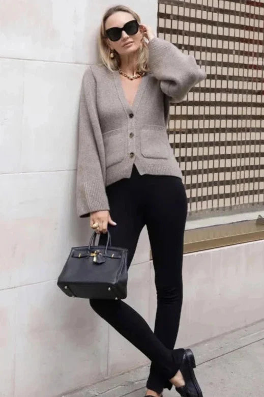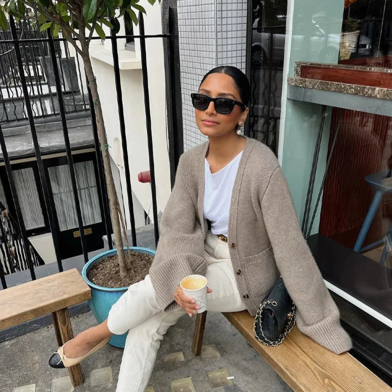 Add a touch of nostalgia to your wardrobe with Bella Chix's Old School V Neck Knit Cardigan. This khaki-colored cardigan features a classic v-neck and convenient front bottom pockets. Stay cozy and stylish with this timeless piece.