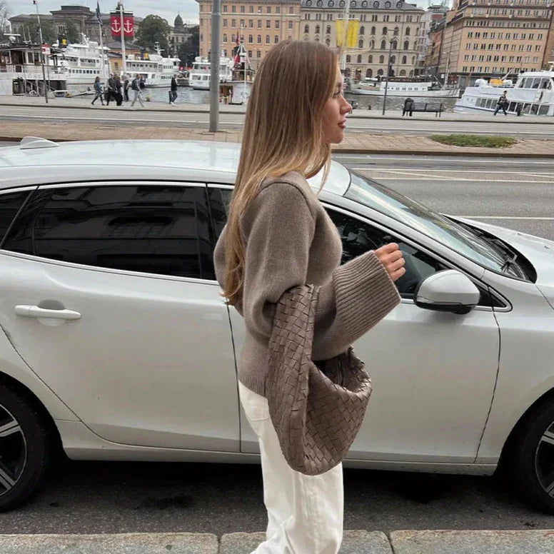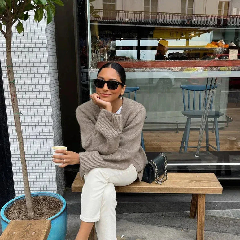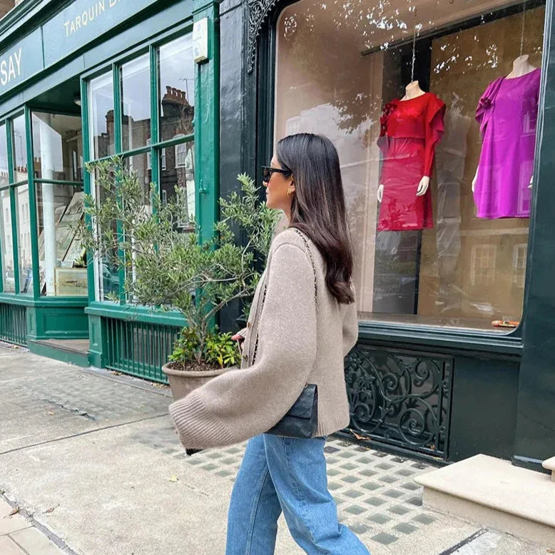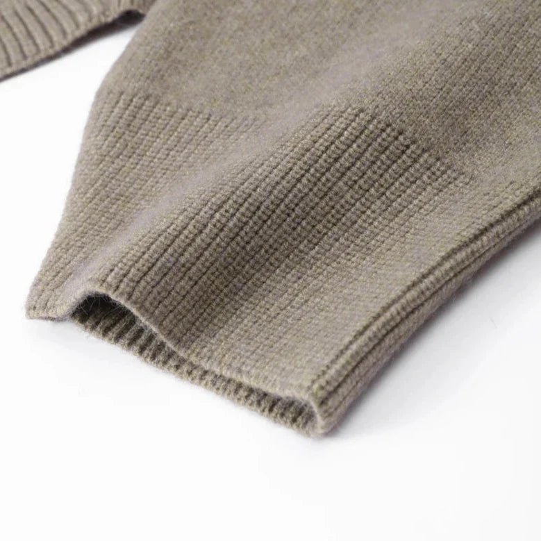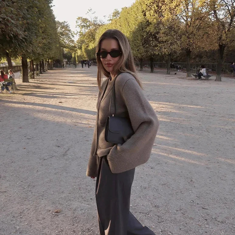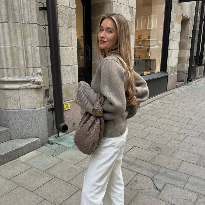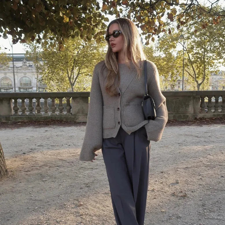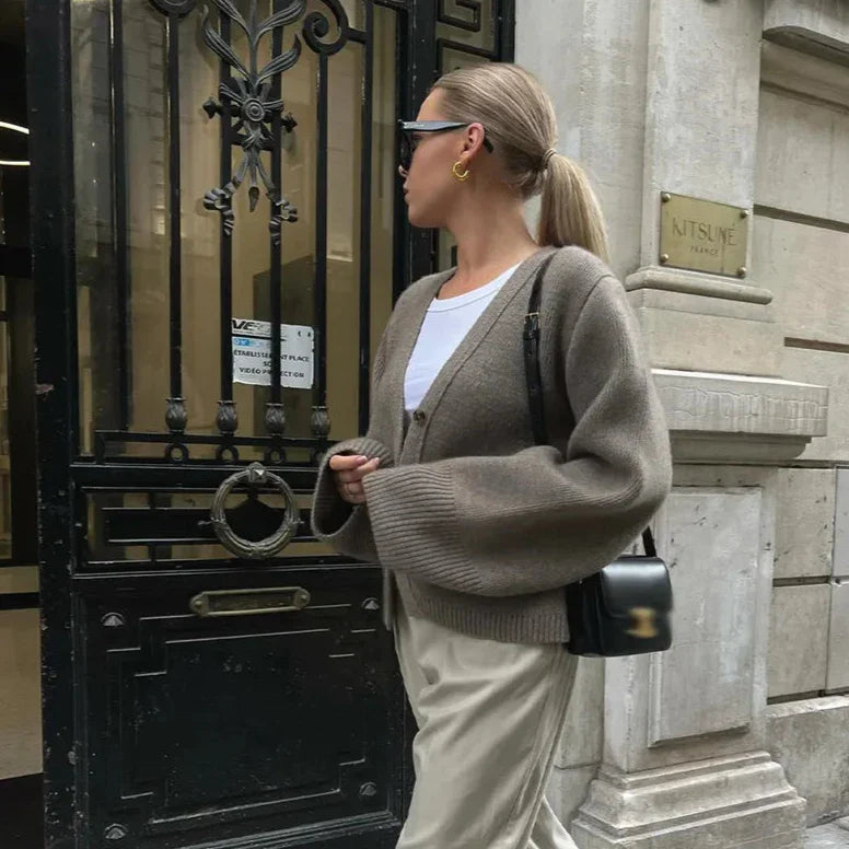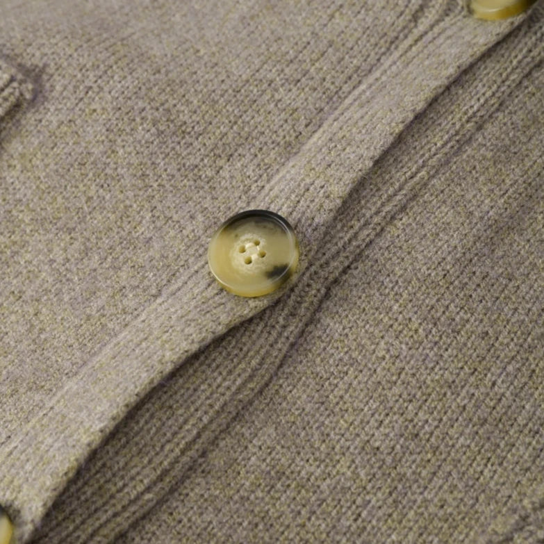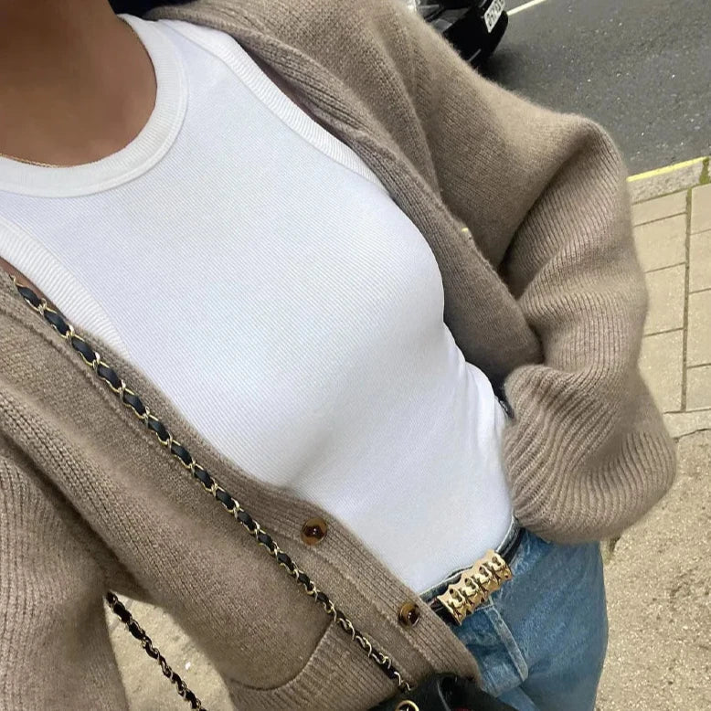 Add a touch of nostalgia to your wardrobe with Bella Chix's Old School V Neck Knit Cardigan. This khaki-colored cardigan features a classic v-neck and convenient front bottom pockets. Stay cozy and stylish with this timeless piece.