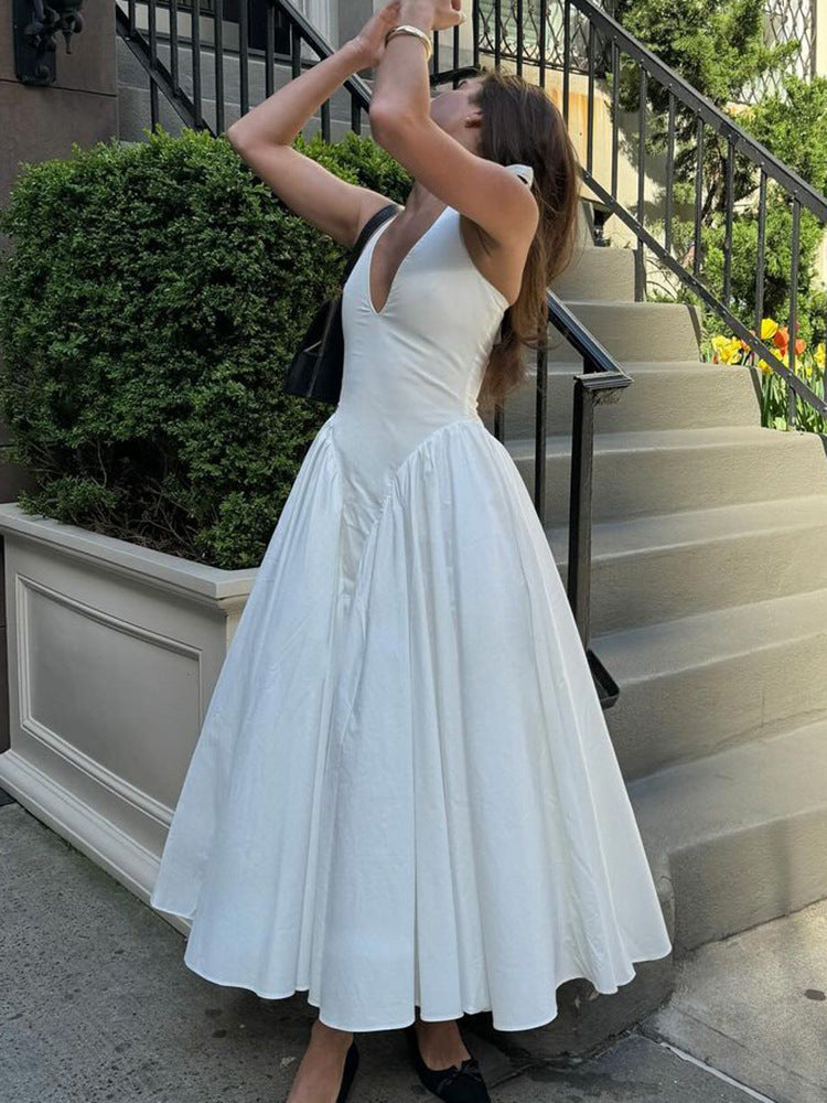 This dress features a deep V-neckline and halter waist design. beautifully accented with pleated stitching to create a sophisticated silhouette.