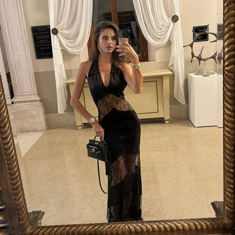Be seductively playful in Bella Chix'x Santana See Through Halter Neck Dress. This lace dress features a flirty see-through design. perfect for a night out. With a backless sleeveless style. it's the ultimate maxi dress for showing off your figure. Embrace your inner fashionista and grab one now!