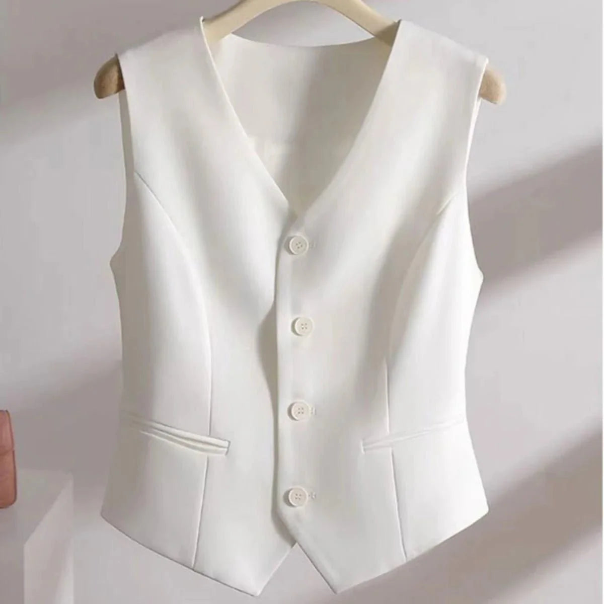 Design: A simple and chic single-breasted vest featuring a V-neckline and sleeveless design. The solid pattern and button detail create a fashionable and casual outerwear piece. perfect for daily wear.