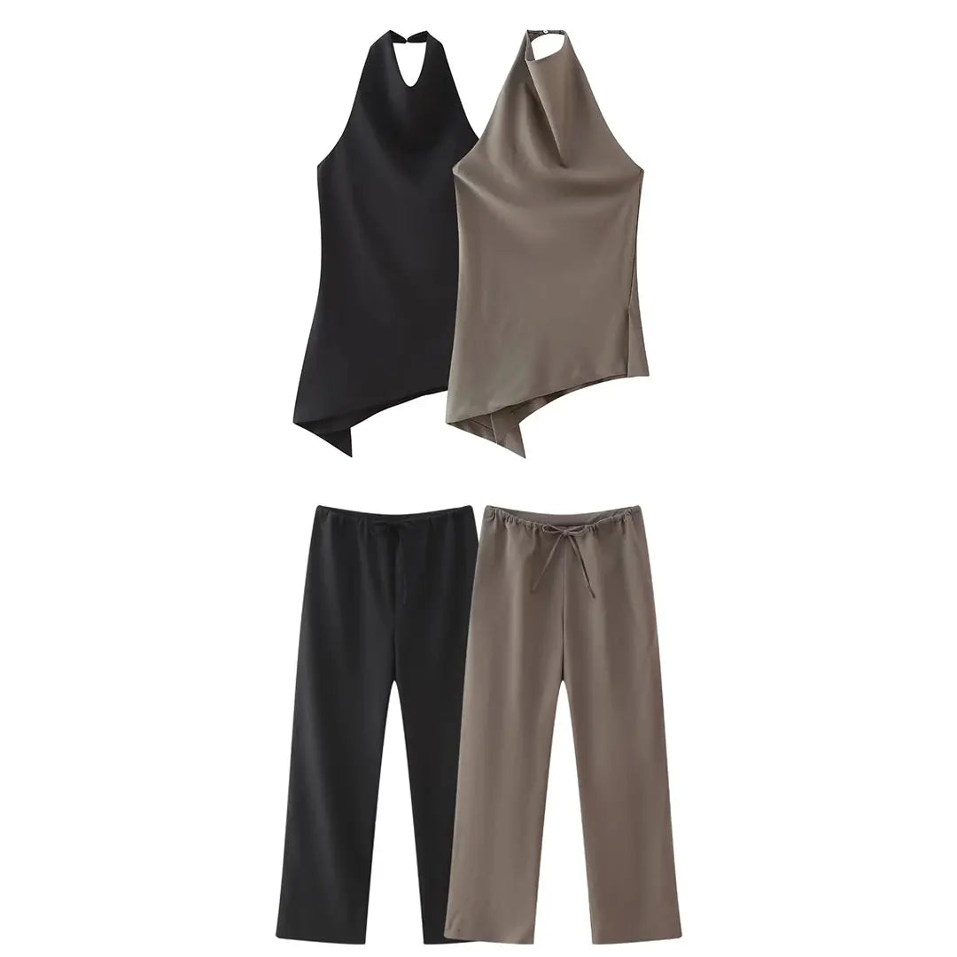 Get ready for some major vacay vibes with this playful pants set by Bella Chix! Featuring a flirty backless halter. an asymmetrical tank top. and drawstring trousers. this set is perfect for lounging in style or hitting the town. Stay comfortable and chic all day long!
